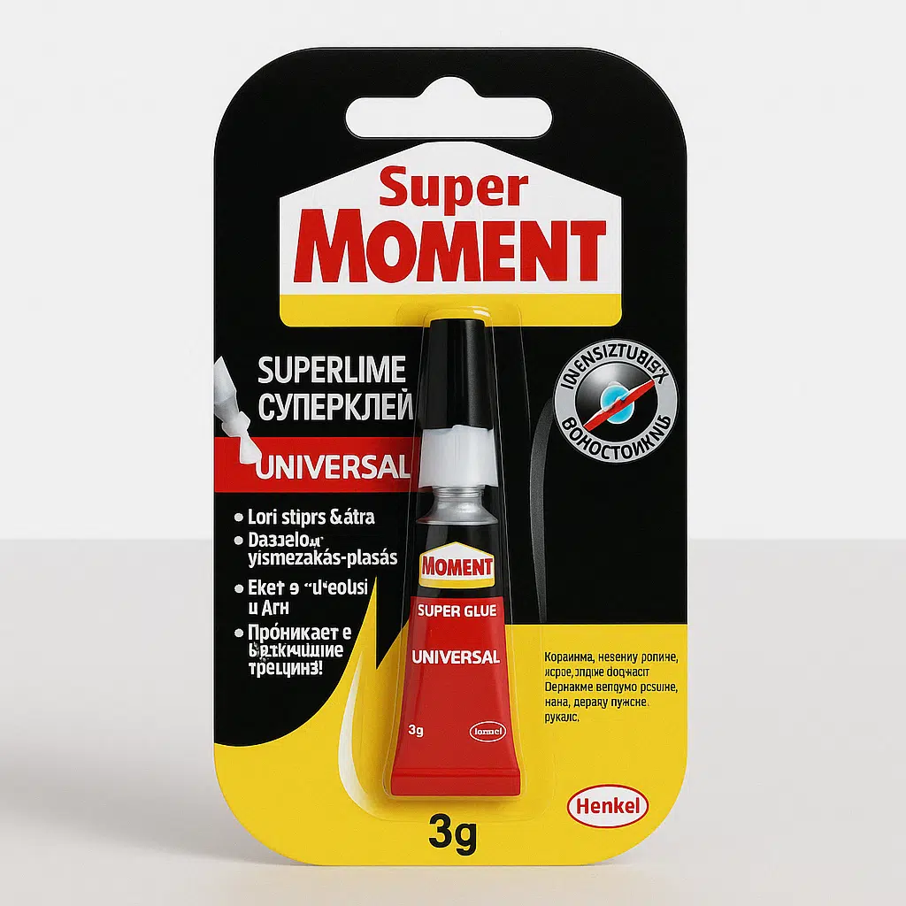 Klijai SUPER MOMENT universal 3g – vienkomponenčiai skysti momentiniai klijai, skirti naudoti namuose, buitinėms reikmėms. Stipriai suklijuoja įvairias medžiagas. Puikiai tinka plastikui, gumai, metalams, medienai, keramikai, odai, audiniams, kartonui ir popieriui klijuoti. Sukibimo greitis: atsižvelgiant į klijuojamą medžiagą, pirminis sukibimas įvyksta per 5–30 sekundžių.